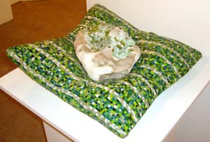 Catégorie Amateur Initié : Maitrepierre Brigitte (France) titre de l’œuvre «le repos du galet » Un silex au milieu d’un coussin de mosaique fait de pâte de verre bleu, vert et blanc, sur le galet des morceau de verre épais et du vitrail de couleur, j’adore, on voudrait essayer nous aussi le coussin.